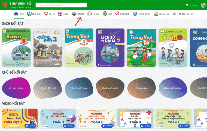 - Bước 1: Sau khi đăng nhập vào Thư viện số, hãy chọn danh mục Podcast ở thanh menu.