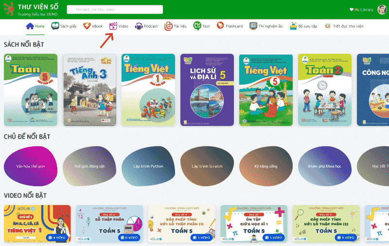 - Bước 1: Sau khi đăng nhập vào Thư viện số, hãy chọn danh mục Video ở thanh menu.