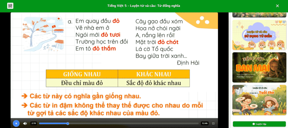 - Bước 4: Trong mỗi video học tập tương tác sẽ tích hợp các câu hỏi yêu cầu học sinh chọn đáp án để có thể tiếp tục xem video. Sau khi xem hết video, học sinh có thể chọn mục Luyện tập để ôn lại nội dung bài học.