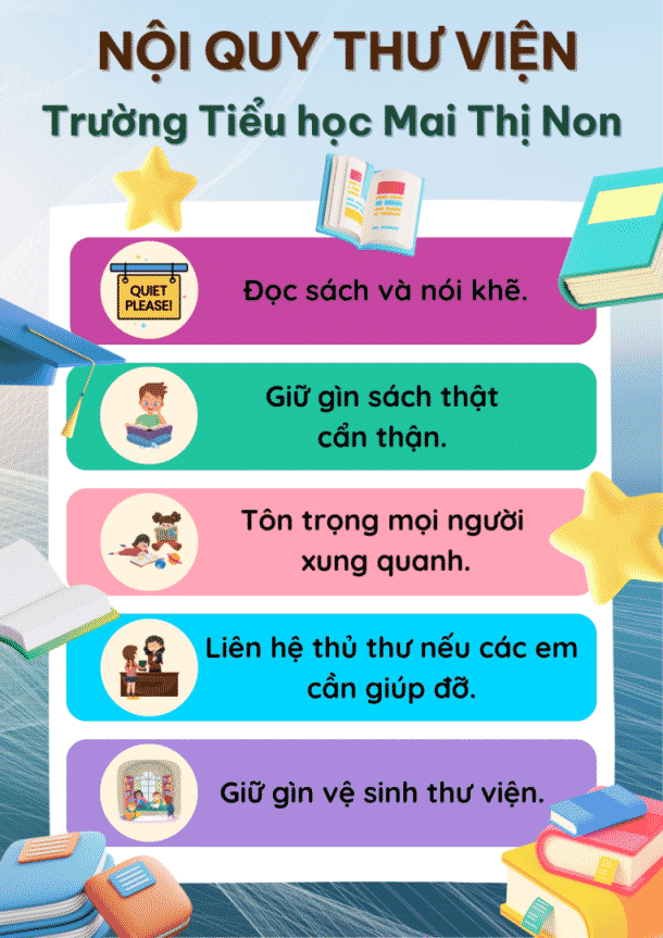 Trong thư viện của trường Tiểu học, mỗi học sinh đều phải giữ cho không gian yên tĩnh, tôn trọng sách và mọi người xung quanh. Việc trả sách đúng hạn và tình thần tự học là vô cùng quan trọng. Các em học sinh sẽ được hòa mình vào thế giới của tri thức, nơi nảy mình giữa những trang sách màu hồng và xanh, mang theo mùi của giấy in và cây viết mới mỗi khi bước chân vào.